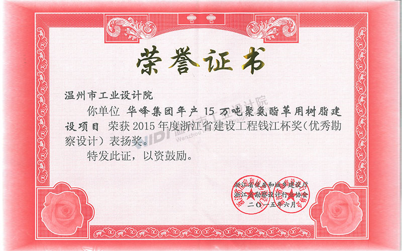 華峰集團(tuán)年產(chǎn)15萬噸聚氨酯革用樹脂建設(shè)項目建設(shè)工程 錢江杯表揚獎